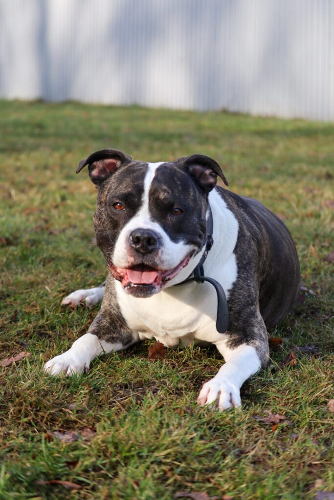 Wichtiger Hinweis: Wir leisten hier Vermittlungshilfe für den Tierschutzverein Bayreuth und Umgebung e.V. 1876., welcher Miley, eine American Bulldog-Mix-Hündin, wie folg beschreibt: Miley ist seit Januar im Tierheim. Sie ist Menschen gegenüber offen und findet jeden toll, der sich mit ihr beschäftigt. Ihre Kraft weiß sie nicht besonders gut einzuschätzen, denn es kann schon mal vorkommen, dass sie voller Freude in Personen hineinrennt und diese dann ordentlich anrempelt. Hier braucht es noch klare Regeln, dass dies nicht in Ordnung ist und sie ihr Temperament etwas drosselt. Ältere Kinder können wir uns gut in ihrem Zuhause vorstellen, da sie bis jetzt Menschen gegenüber nie negatives Verhalten gezeigt hat. Nur kleinere Kinder würden wir aufgrund ihrer ungestümen Art eher nicht in ihrem zukünftigen Heim sehen. Auch an ihrer Leinenführigkeit muss noch gearbeitet werden. Hier besteht vor allem Übungsbedarf beim Fokus auf den Menschen, da MILEY mit ihrem Kopf überall ist. Andere Hunde findet Miley nicht sonderlich toll. Wird sie angepöbelt, kann sie sich sehr hineinsteigern und findet von selbst kaum aus der Situation heraus. Hilft der Mensch ihr, beruhigt sie sich schnell wieder und zeigt auch kein Übersprungsverhalten, wie etwa Schnappen. Bei kleinen Hunden müssen Ihre Menschen besonders aufpassen, da sie diese schnell als Beute einordnet. In ihrem neuen Zuhause sollten keine Kleintiere leben, da sich bei deren Anblick ihr ausgeprägtes Beutefangverhalten zeigt. Miley hatte eine Kreuzband OP, weshalb schnelle hektische Bewegungen eher zu vermeiden sind. Zudem ist sie stark übergewichtig, was natürlich hierfür nicht förderlich ist. Moderate körperliche Auslastung in Verbindung mit Kopfarbeit sollte hier das Ziel sein. Wir wünschen uns für Miley konsequente Menschen, die aber ebenso liebevoll mit ihr umgehen. Ein ländliches Zuhause wäre schön für sie. Bei Interesse kann direkt mit dem TSV Bayreuth in Kontakt getreten werden: Jakobstraße 120, 95447 Bayreuth. Telefon: 0921/62634, Email: info@tierheim-bayreuth.de